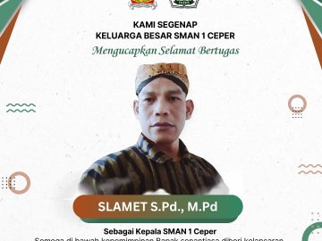 Keluarga besar SMA N 1 Ceper Mengucapkan Selamat bertugas Kepada SLAMET, SPd.M.Pd, Sebagai Kepala Sekolah yang baru : ” Semoga di bawah kepemimpinan beliau senantiasa diberi kelancaran keberkahan dan kesuksesan dalam menjalankan amanah
