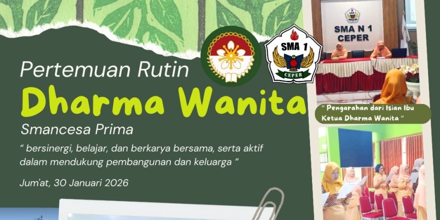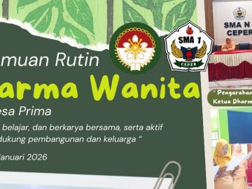 Hari,Tgl : Jumat, 30 Januari 2026Waktu : Pukul 11.30 s.d selesaiPeserta : 27 anggota hadir Agenda Acara:Pembukaan1. Menyanyikan mars dan hymne dharmawanita2. Pembacaan Notulen oleh Ibu. Nurjanah3. Sambutan Ketua DWP SMA N 1 Ceper. Ny. Sri Nuryati Slamet4. Isian kegiatan: Penyampaian informasi tentang carahidup sehat menurut Rasulullah oleh Ibu. Sri Wahyuni5. Perkenalan anggota baru Dharmawanita6. Lain-lain7. Penutup Materi IsianTips sehat ala Rasulullah SAWTips sehat ala Rasulullah SAW meliputi menjaga kebersihan, pola makan sederhana (sepertiga makanan, sepertiga minuman, sepertiga napas), olahraga rutin (jalan kaki, memanah), tidur teratur (tidur awal, bangun dini hari untuk tahajud), puasa sunah (Senin-Kamis), manajemen stres (zikir, berpikir […]